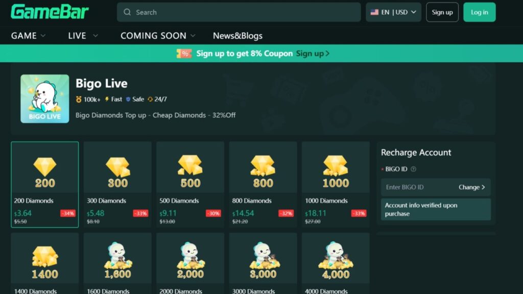 - Head to the Site: Open your browser and visit www.gamebar.gg. Select BIGO LIVE from the top-up menu.