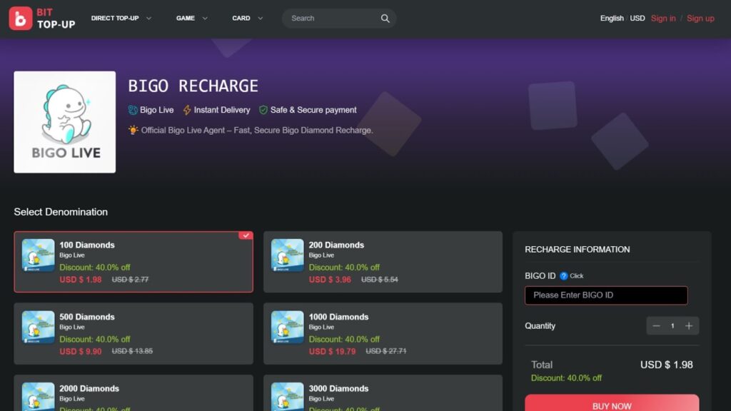 You can always use the official BIGO LIVE app or the main website for quick diamond purchases through Apple Pay, Google Pay, or your bank card. These options are safe, but they usually cost more because app stores add extra fees. These fees can reach 10% to 30%, which is why something like 100 diamonds can end up costing around 3.14 dollars.