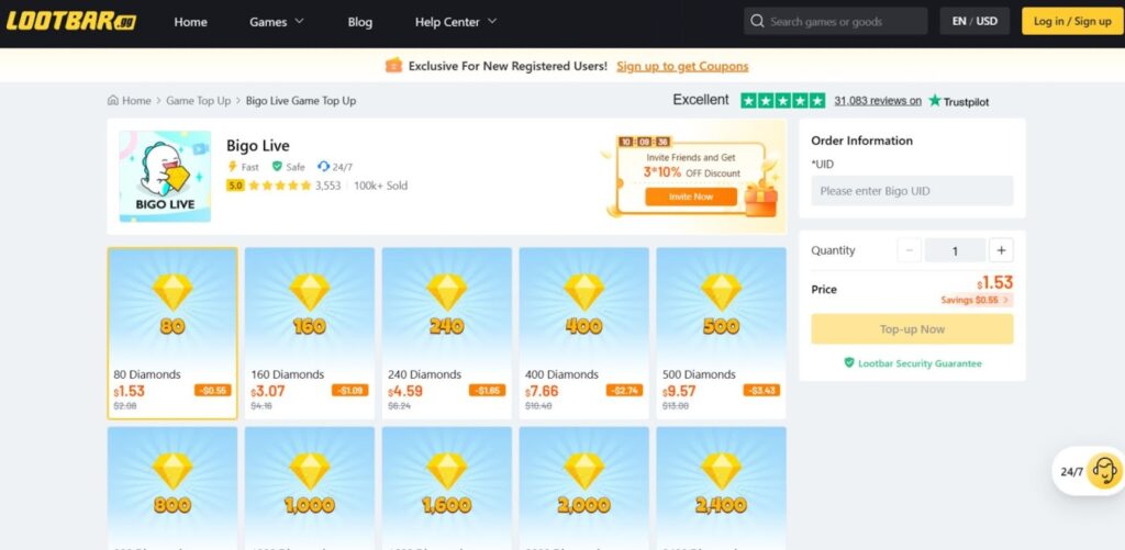 | LootBar.gg | $19.14 | <3 minutes | PayPal, Cards, E-wallets, Bank Transfer | Invite friends for 10-50% coupons; Bulk discounts for 5,000+; Up to 22% off ongoing | 4.9/5 (100k+ orders, 5-star for BIGO) |
